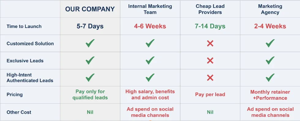 This includes the package you choose (whether it’s Leads Only or Done-For-You Customer Acquisition), lead exclusivity, and the volume of leads you need.